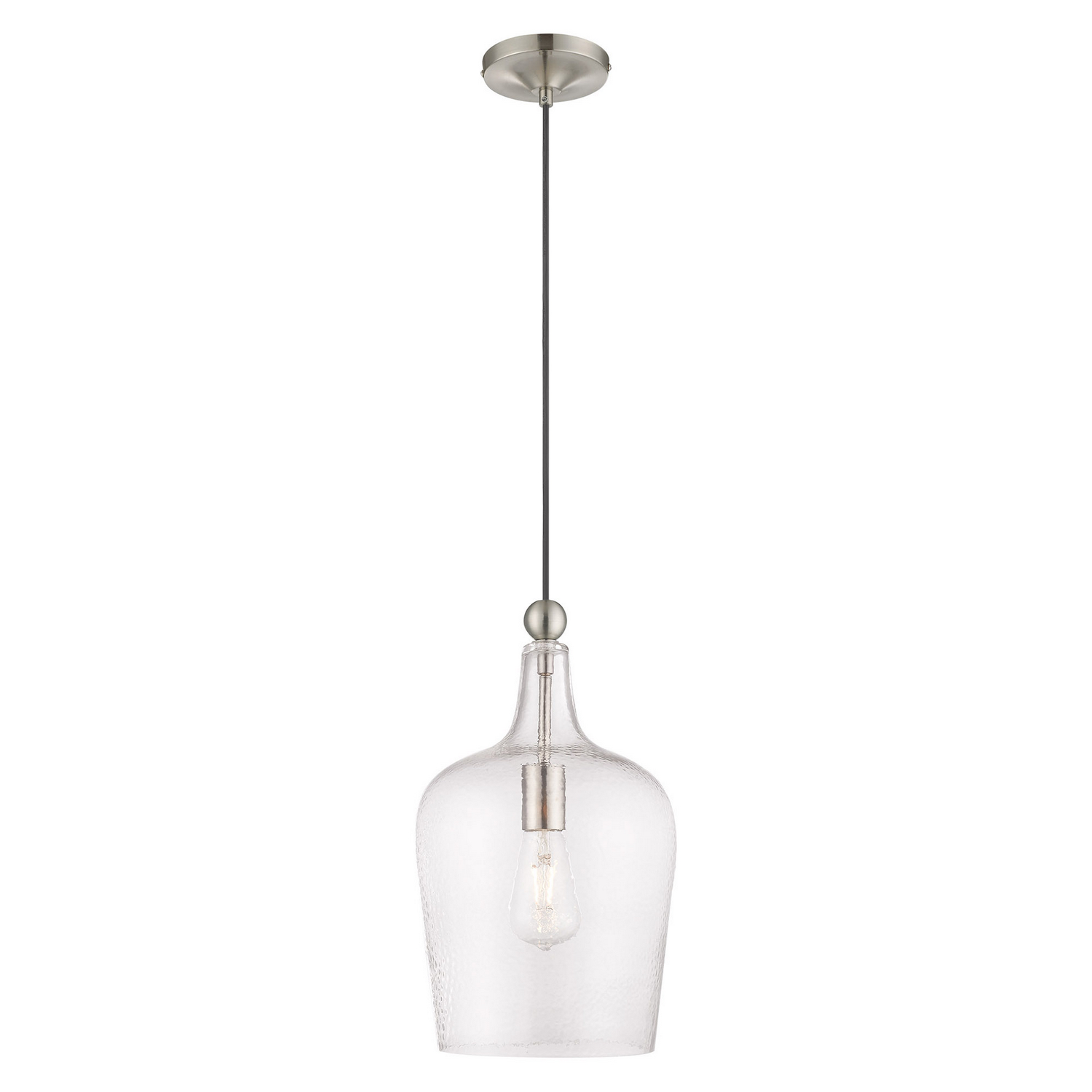 Featuring a black pendant cord and brushed nickel hardware this graceful carafe shaped clear glass mini pendant will add a real simple look to any kitchen, bar, and hallway.