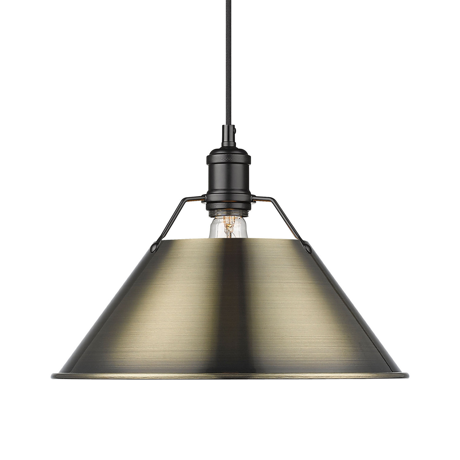 Bring industrial elegance into your home with the Yep by Golden Lighting Orwell 1-light 14in Pendant. Featuring a metal shade and a matte black frame, it creates a welcoming atmosphere. The metal shade, finished in Aged Brass, offers a warm, inviting glow while its textured surface beautifully diffuses light. The shade’s antiqued finish adds character, making it a perfect match for vintage or industrial styles. Crafted with a timeless matte black finish, this pendant enhances any decor. Its clean lines and smoothly finished surface make it ideal for minimalist or contemporary settings. This fixture is suitable for damp locations, perfect for kitchens, dining rooms, and entryways. It is compatible with sloped ceilings and allows for adjustable height (17.5″ to 131.5″) to fit your space needs. Overall dimensions are 14″W x 10″H x 14″D, and it requires 1 E26 Medium base bulb (not included, maximum 100 watts). Elevate your interior while ensuring quality and style with this statement pendant light.